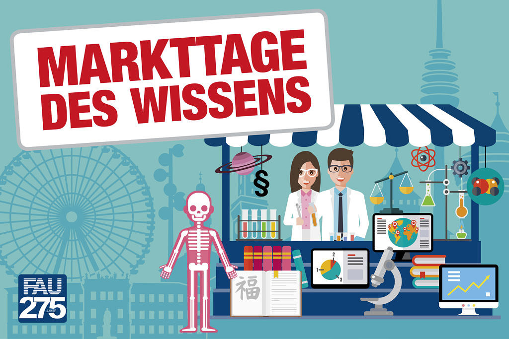 Bei der Langen Nacht der Wissenschaften kommen die Bürgerinnen und Bürger der Region zu uns in die Uni. Im Jubiläumsjahr will die FAU dorthin gehen, wo die Menschen sind. Für jeweils einen Tag erweitert die FAU das Angebot auf den Marktplätzen von Erlangen, Fürth und Nürnberg: An eigenen FAU-Marktständen werden Wissenschaftlerinnen und Wissenschaftler den Besucherinnen und Besuchern in kreativen Aktionen ihr Wissen und ihre Forschung als „Lebensmittel“ anbieten.